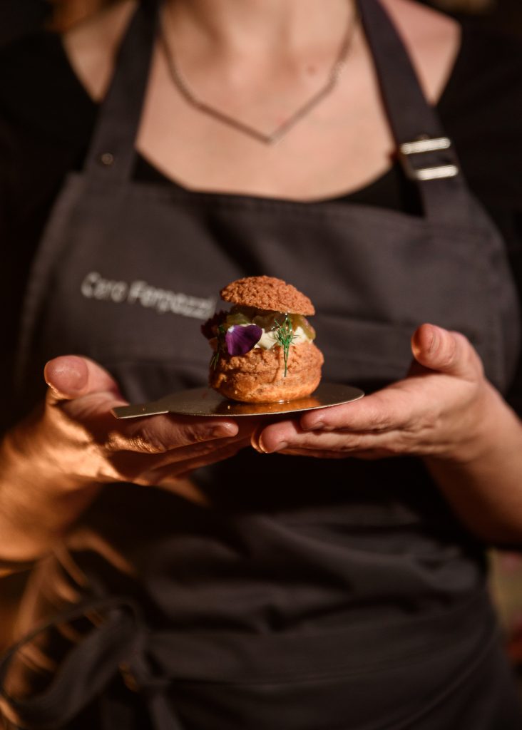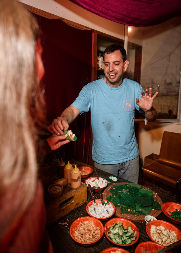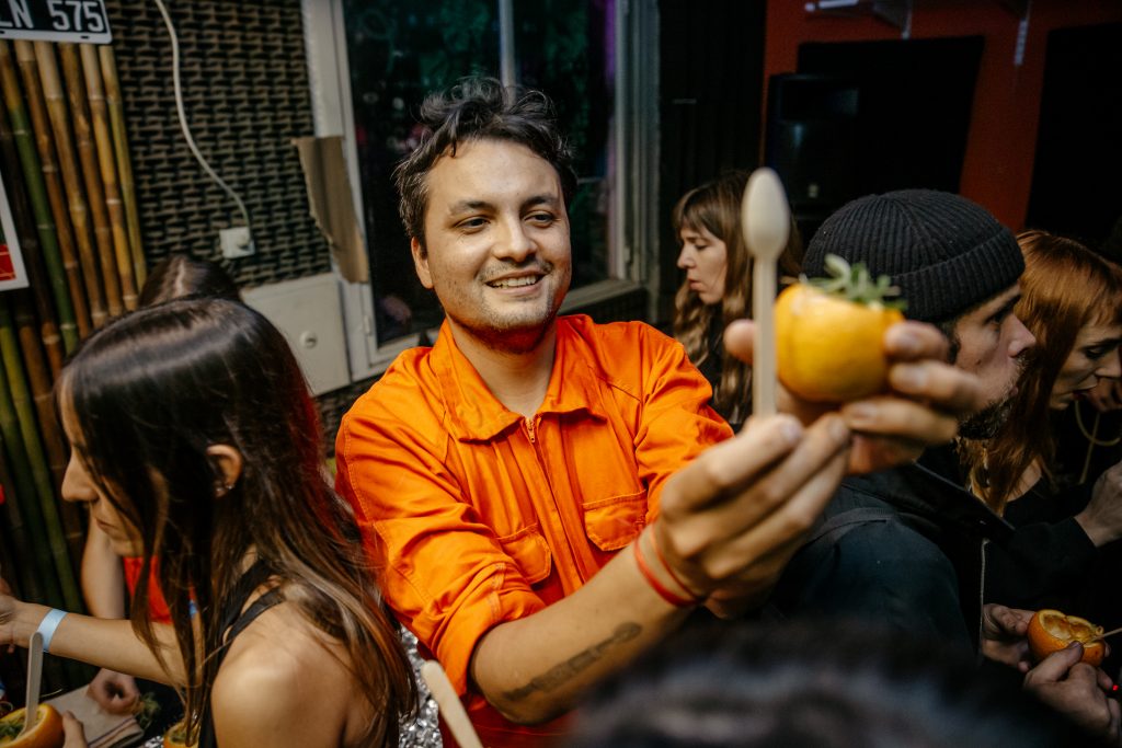A unos pocos metros, Julia ft. Silvestre y la Naranja nos transportaron a una fresca selva amazónica. Comimos un ceviche de boniato cocido en fuego servido en una naranja mientras que el mismísimo Julio Martín Báez, a modo karaoke, tomó el micrófono del cantante de la banda y juntos cantaron “Promesas sobre el bidet” a todo pulmón. La intimidad creada en esa sala fue algo para atesorar.