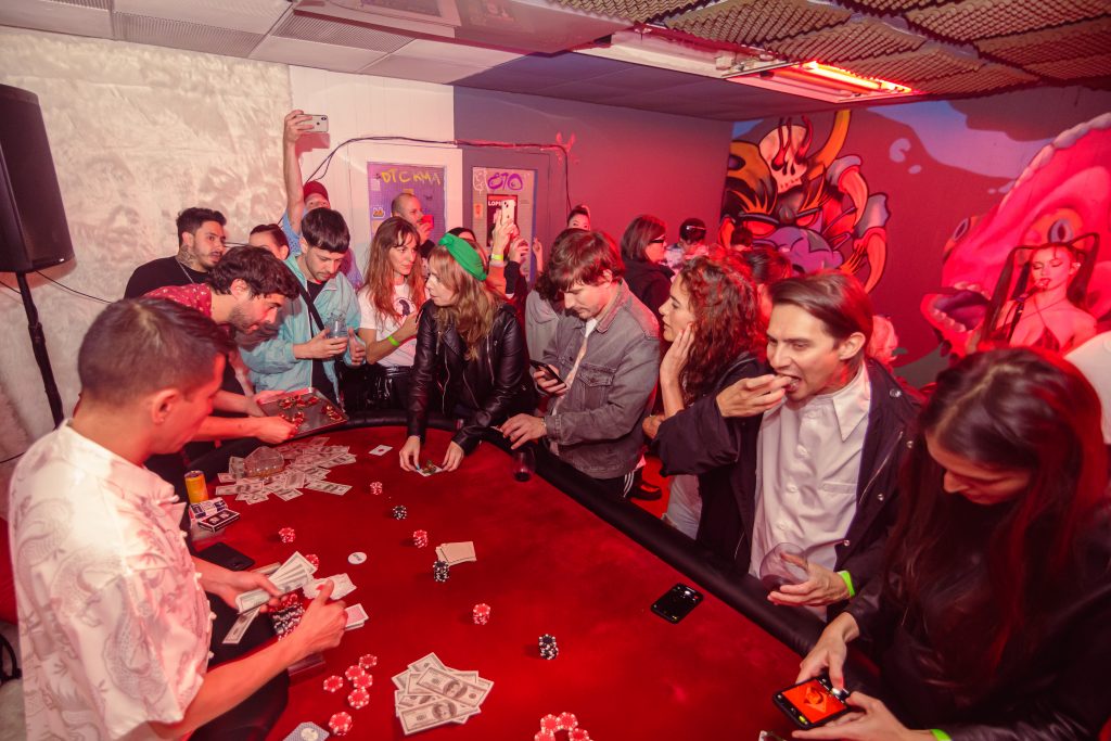 Niño Gordo ft. Six Sex nos llevaron a un casino oriental con aires mafiosos. Al ingresar a su sala iluminada íntegramente de color rojo supimos que la idea no era simplemente comer y mirar a una artista, la idea era vivir una experiencia multisensorial. Francisca Cuello, alias Six Sex, inundó la sala con su impronta nasty y cute a la vez. Vestía un top y pantalón cut-out, uñas XL, peinado y maquillaje intactos. Cada detalle estaba pensado. En su sala también había una moto sobre la que cantó algunos de sus temas y una mesa de póker. La acompañaban bailarinas y actores que simulaban ser croupiers y entregaban sobre un naipe comestible un tataki de la parrilla asiática más codiciada de Palermo.