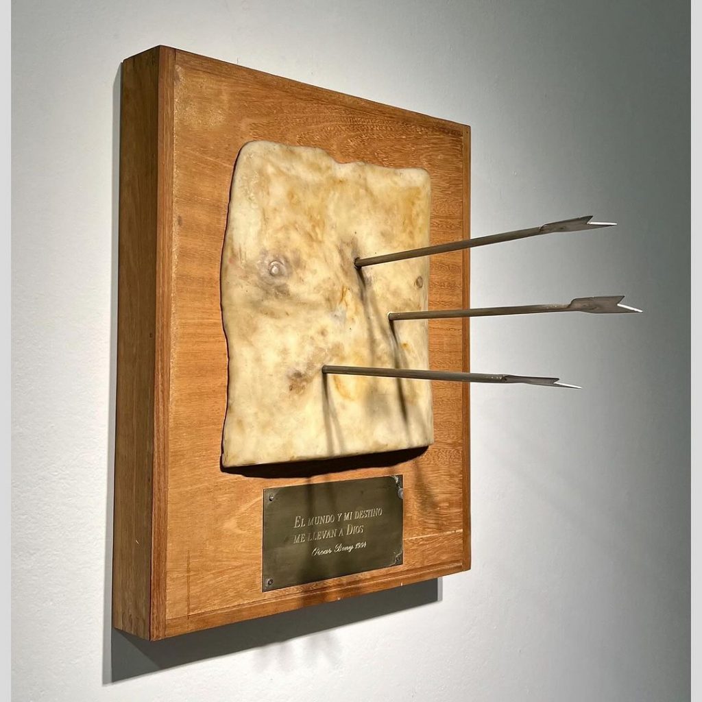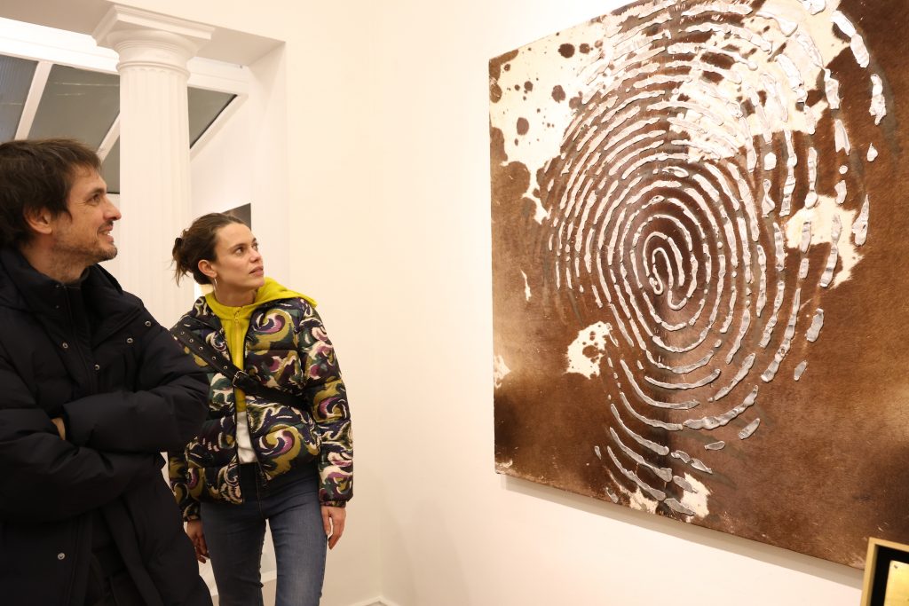 Pero el juego de contrastes continúa, y no se puede bajar la guardia ya que una enorme huella dactilar impresa sobre cuero vacuno se filtra por la derecha mientras más abajo es atesorada una mariposa disecada en una cajita de madera y vidrio, acompañada por la cita que da cuenta al nombre de la muestra “el pensamiento es productor de materia.”