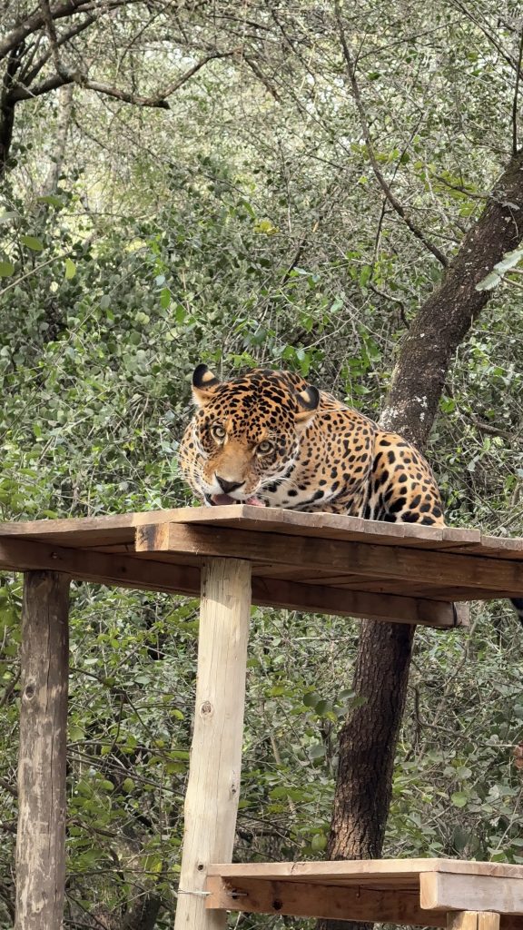 Porá es el yaguareté de ocho años que pudimos ver en la estación biológica El Teuco. Está allí como parte de la educación ambiental y lo visitan turistas y estudiantes de escuelas de la zona. Nació en un zoológico en Brasil y come 2kg 200 de comida por día. Es un animal excesivamente magnético que te atrae con cada movimiento y mirada. Sus manchas cumplen el rol de huella digital. Cada uno tiene una trama distinta que lo distingue de los demás.