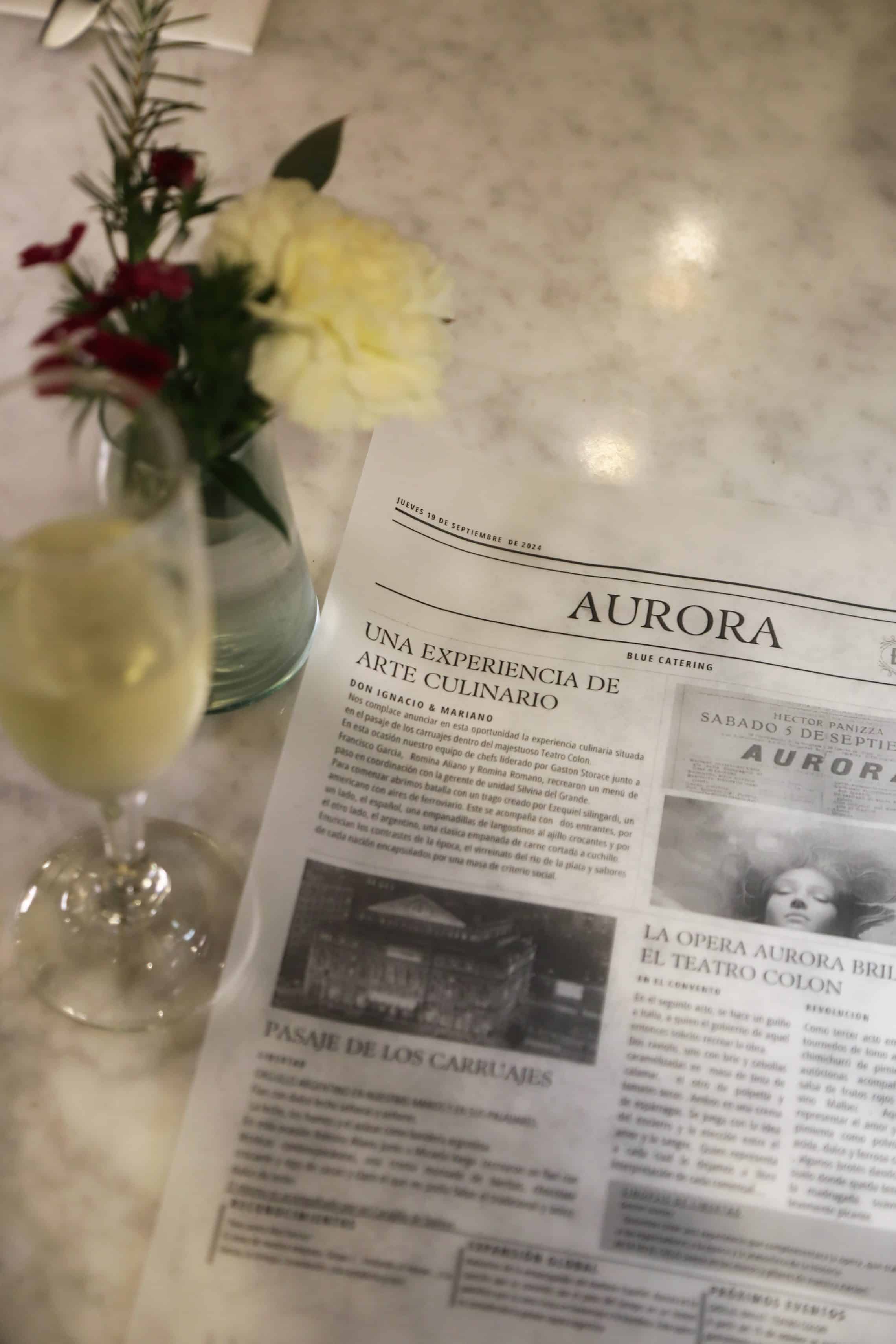 Al chef le divirtió la idea de recrear la hoja del diario del primer estreno de la ópera para contar el menú de esta noche: Don Ignacio & Mariano (Primer Acto), En el convento (Segundo Acto), Revolución (Tercer Acto) y Libertad (Final), son los cuatro pasos de esta propuesta, que está vigente los días de la función de la Ópera. Aurora es una historia de amor, que representa el conflicto del Virreinato, la lucha por la independencia y todas sus contradicciones y conflictos.