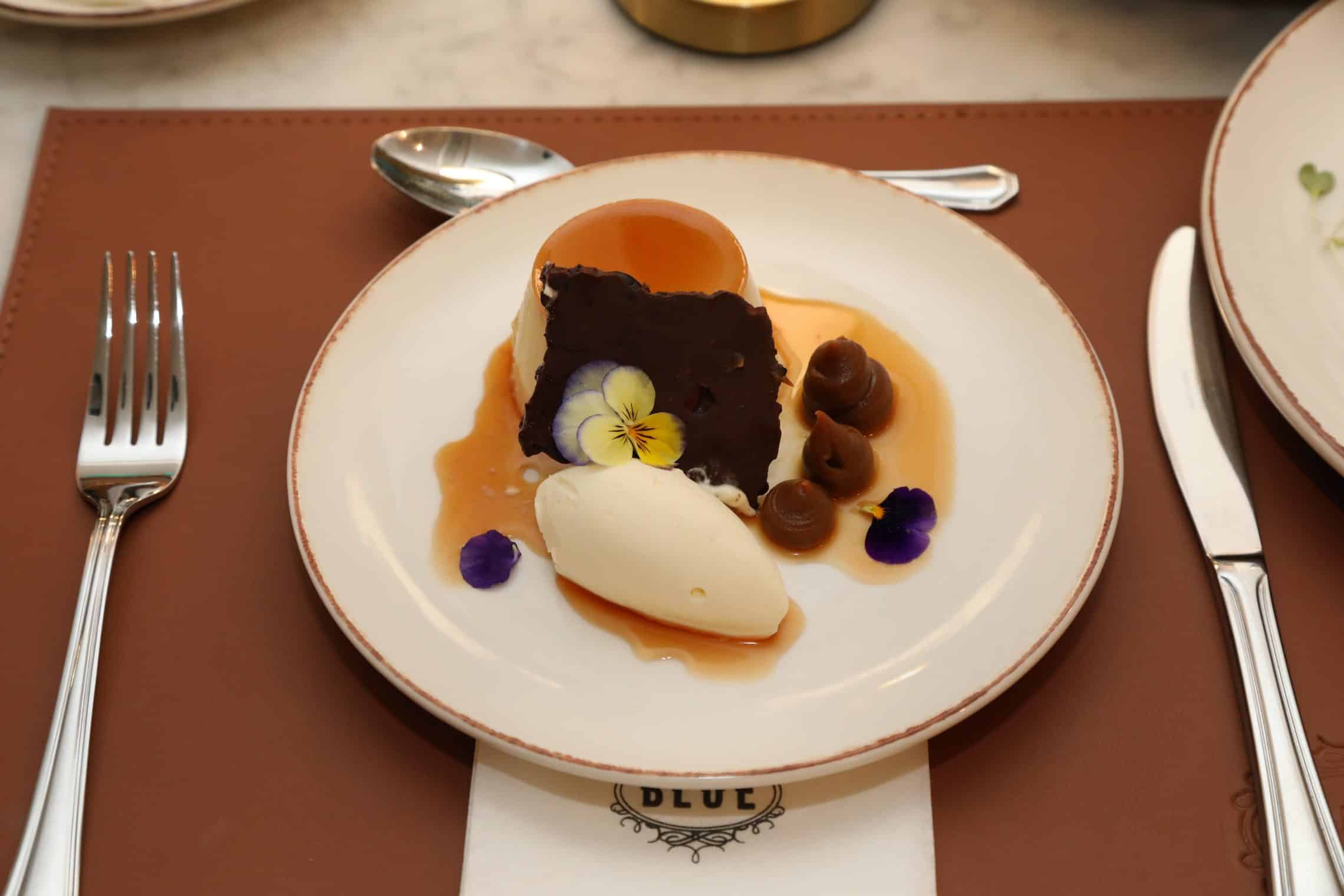 Llega la parte del postre, el gran final de esta obra. Silvina, que de chica fue parte del coro de niños del Colón, pide que pongan “Alta en el cielo” para acompañar “Libertad”, un súper flan de dulce de leche bien argentino, con una crema montada de hierbas y nibs de cacao, coronado con licor de baileys, y flores orgánicas.