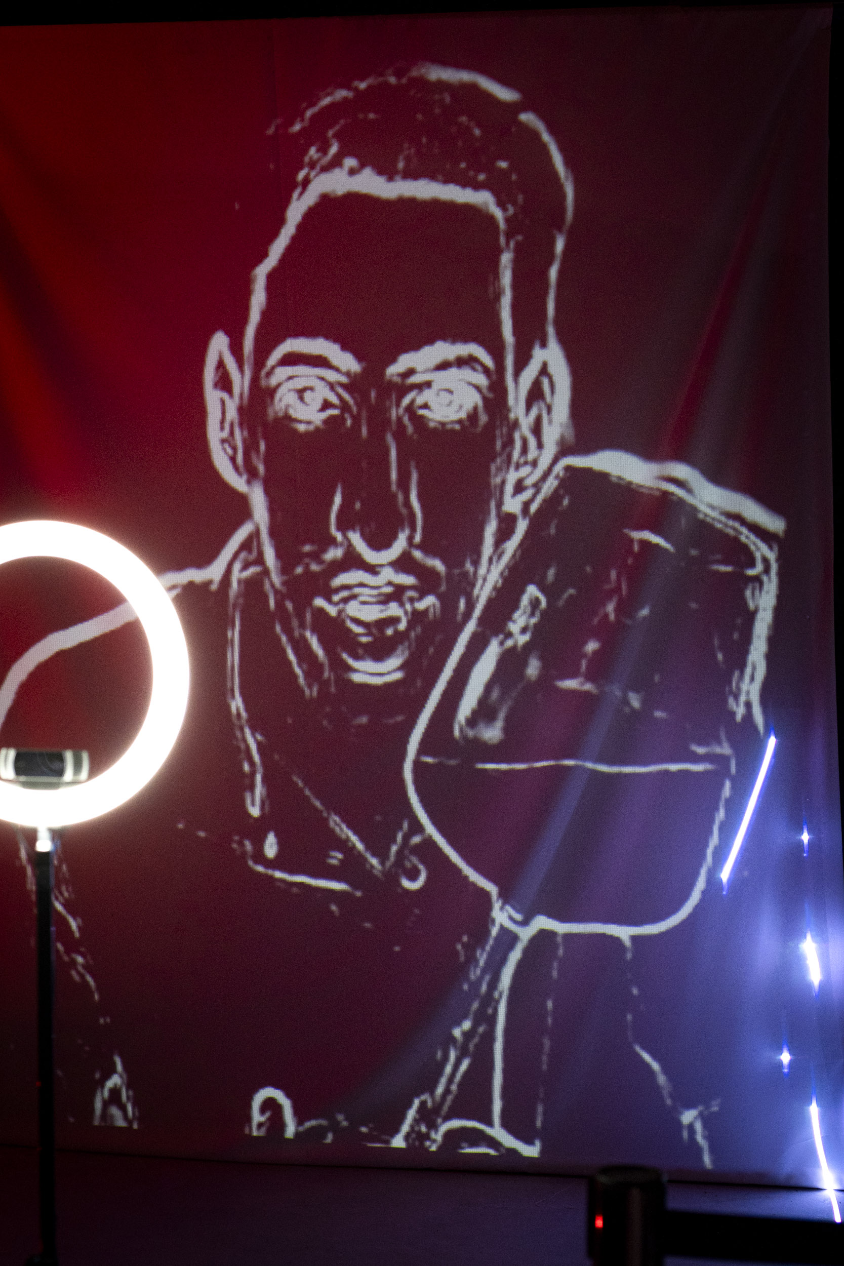 “Si no está la persona no hay obra”, explicó Solimano al encontrarnos frente a Ecos de Laureano Solis, Ignacio Bruno y Sofia Garazurret. Obra interactiva que requiere de un espectador que la active. Un aro de luz espera la llegada de una cara a la que iluminar. Al instante el reflejo aparece proyectado en una gran pantalla de forma caricaturesca. Es el estilo que los artistas han elegido para procesar los rostros que participen de la experiencia. A su vez, un láser dibuja ojos y bocas en colores encima de la proyección.