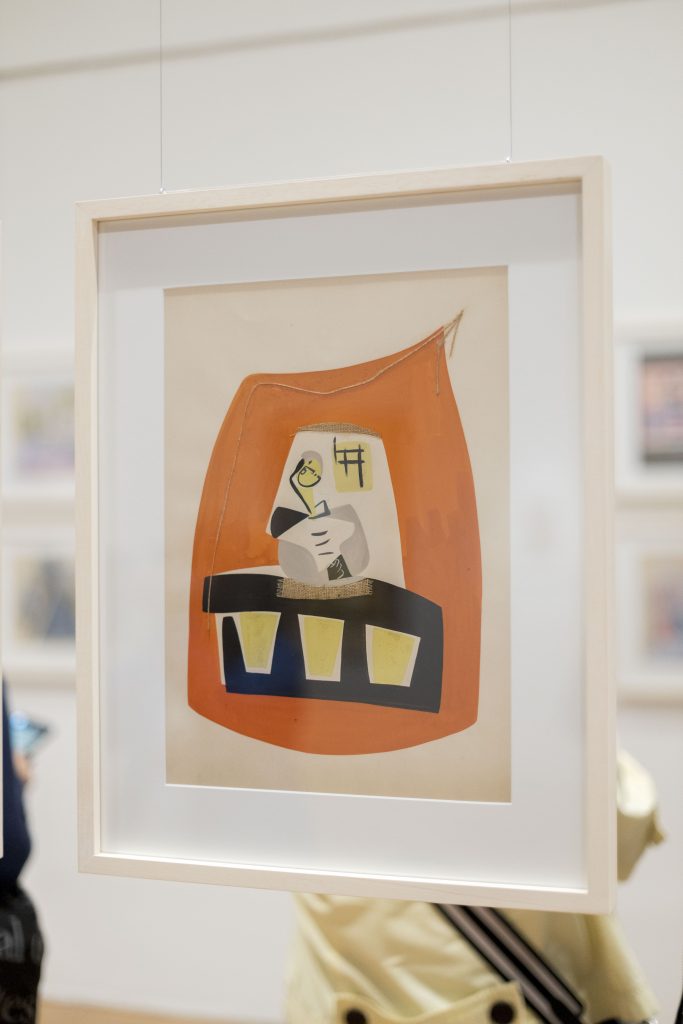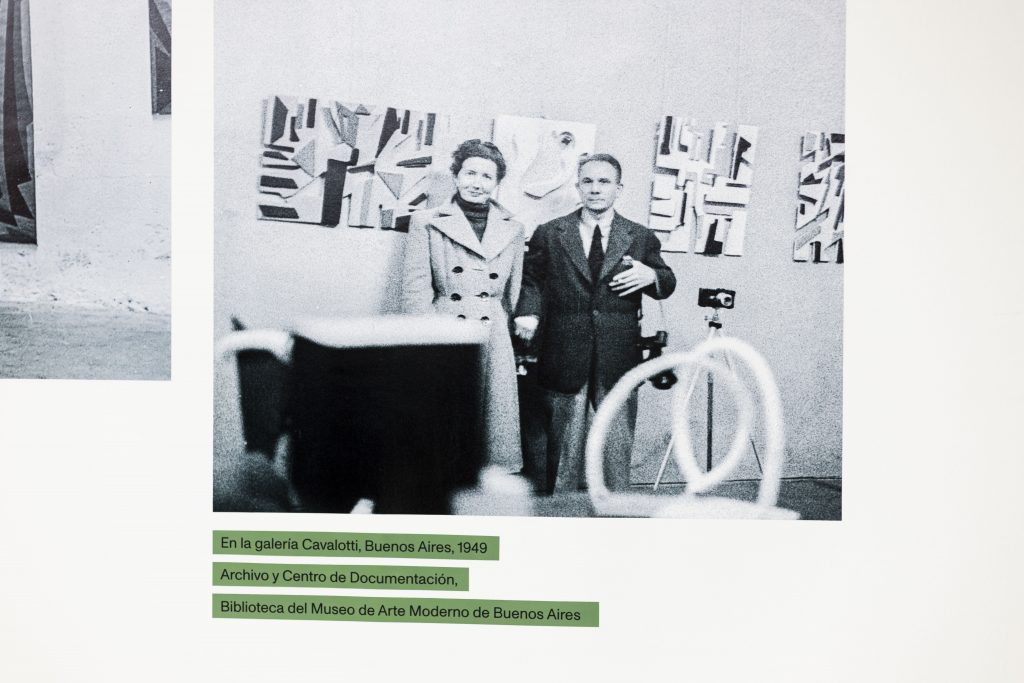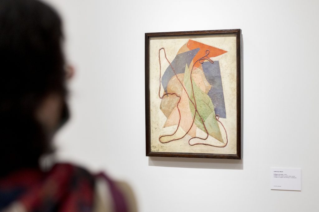 En el primer núcleo de la muestra, vemos como la pareja transita un recorrido común de investigación. Mientras que Del Prete trabajaba en fotomontajes, pinturas abstractas, collages con piolines y láminas metalizadas y esculturas en yeso tallado, Yente estudiaba filosofía y hacía caricaturas e ilustraciones para revistas y retratos familiares. Después del encuentro con Del Prete inició su investigación en la abstracción; hacia 1937 realizó sus composiciones biomórficas: núcleos redondeados y coloridos que a veces presentan elementos figurativos. Es interesante ver que la pareja se forjó dentro de los roles de género vigentes de la época, y que por ende la carrera de Del Prete, resultó privilegiada.