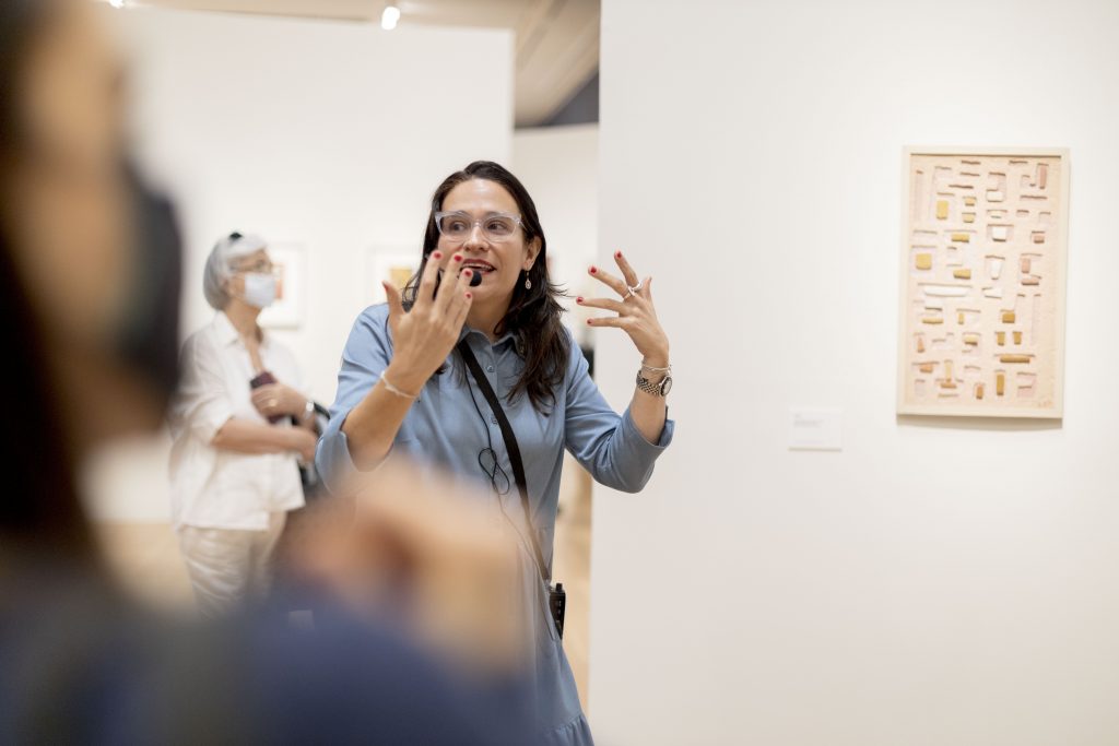 Marita García, curadora de la muestra, durante el recorrido para prensa del que participó MALEVA.
