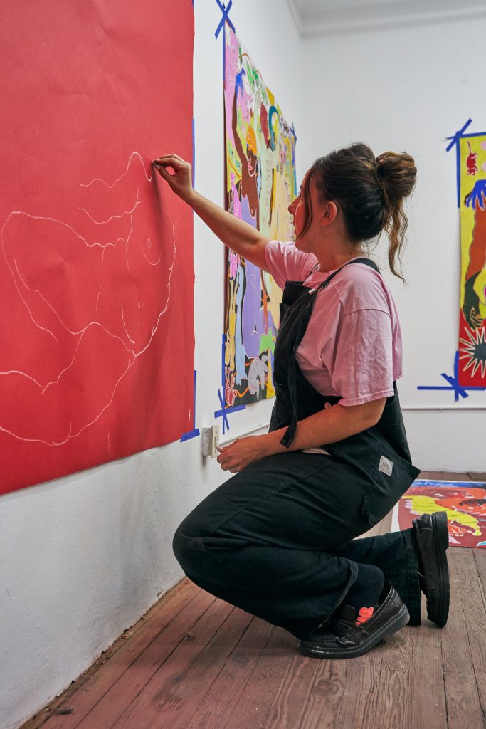 Subo unas escaleras que me conducen a un espacio tranquilo, donde suena un disco de The Police y una chica que viste un jardinero negro y un gancho rojo en la cabeza me recibe. Cuando visito talleres me atraviesa una sensación de calidez que se mezcla con una emoción casi eufórica. «Espero que nunca desaparezca» me digo a mí misma. Amparo podría ser una actriz italiana de los años 60. Es cálida y le encanta hablar. Entre obras colgadas en la pared y un arsenal de materiales sobre una modesta mesa, enseguida me siento a gusto. Quizás porque hace tiempo que sus obras me atraen, un flechazo que sucedió en arteba 2021 y luego en una muestra que presentó en la galería Grasa, donde me encontré sumergida entre grandes dibujos de cuerpos escultóricos y sensuales que estallaban de color. En esta nota de MALEVA, hablamos de todo con Amparo Viau, una maga de la tiza.